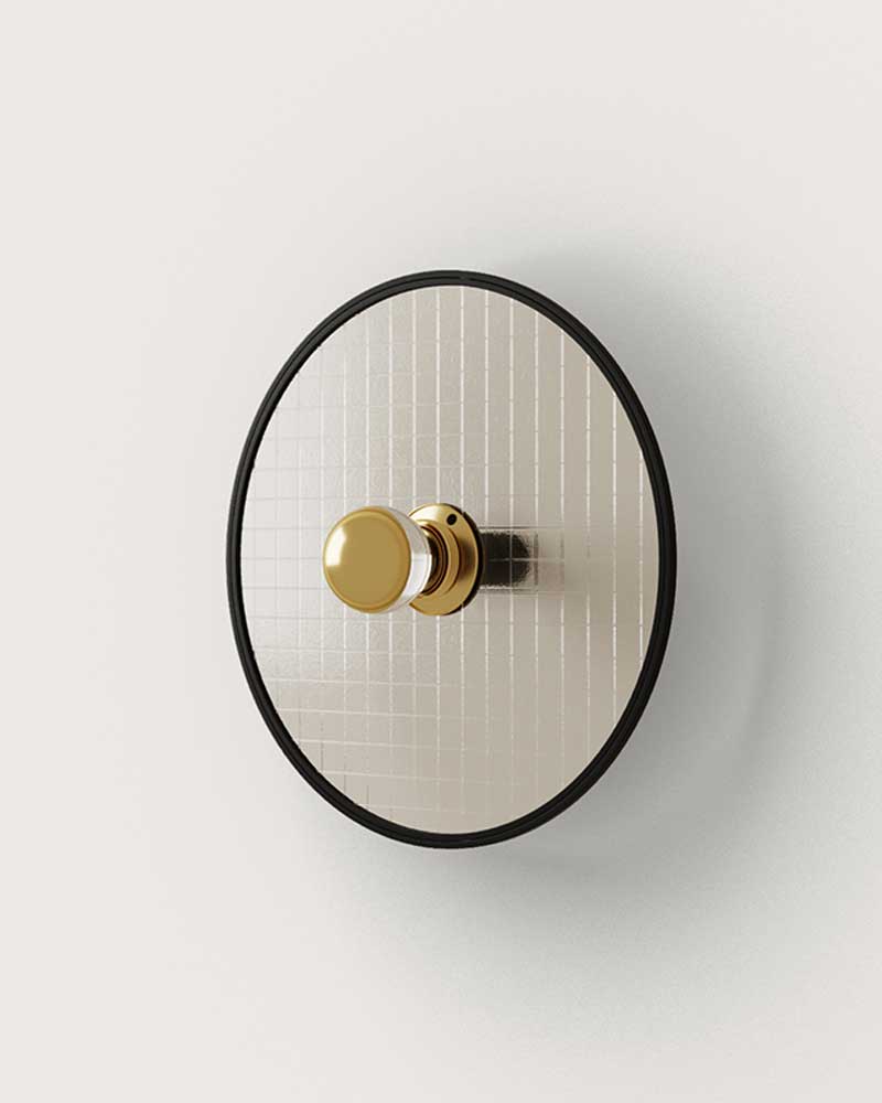 Aplique de pared compuesto e una base metálico disponible en diferentes acabados con disco decorativo de cristal con cerco en color negro.