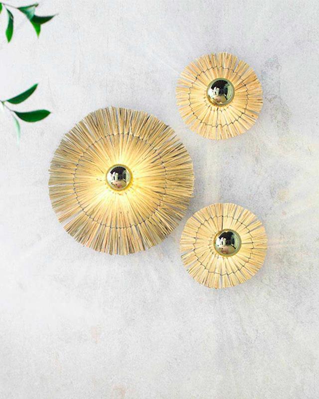 Aplique de pared configuraba compuesto de un soporte de metal en diferentes longitudes y tamaños con reflector disco de paja natural.