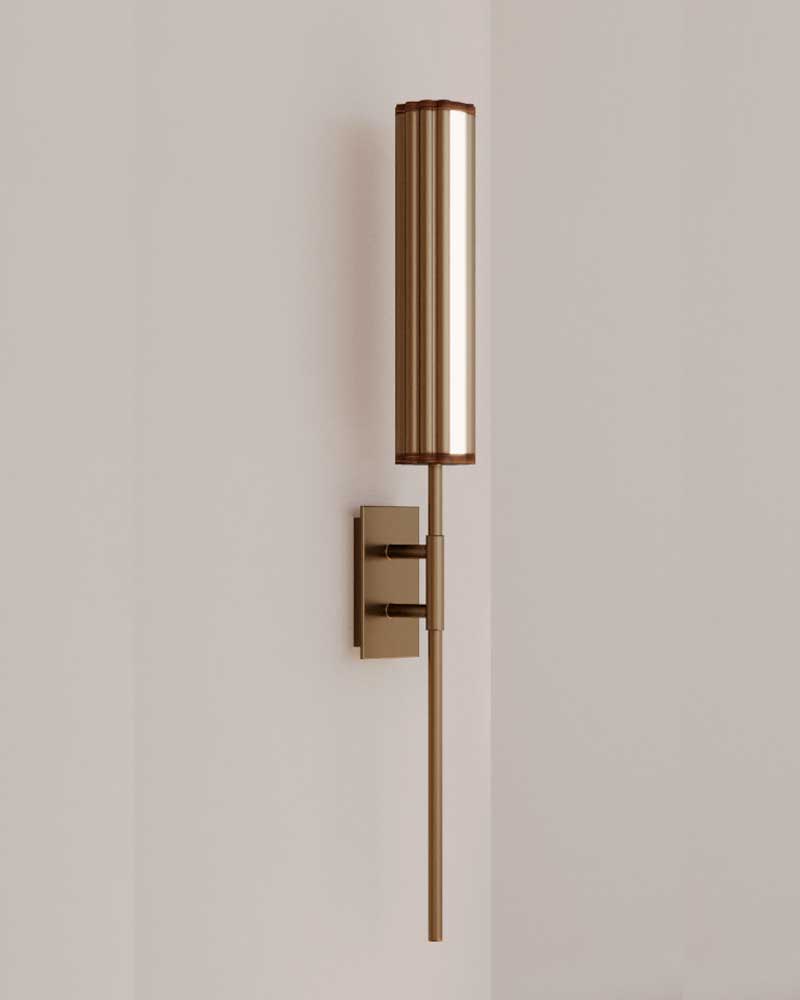 Aplique de pared fabricado en madera de nogal con detalles metálicos en diferentes acabados a elegir.