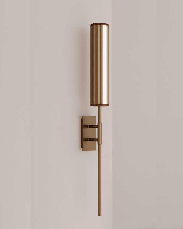 Aplique de pared fabricado en madera de nogal con detalles metálicos en oro envejecido o negro mate