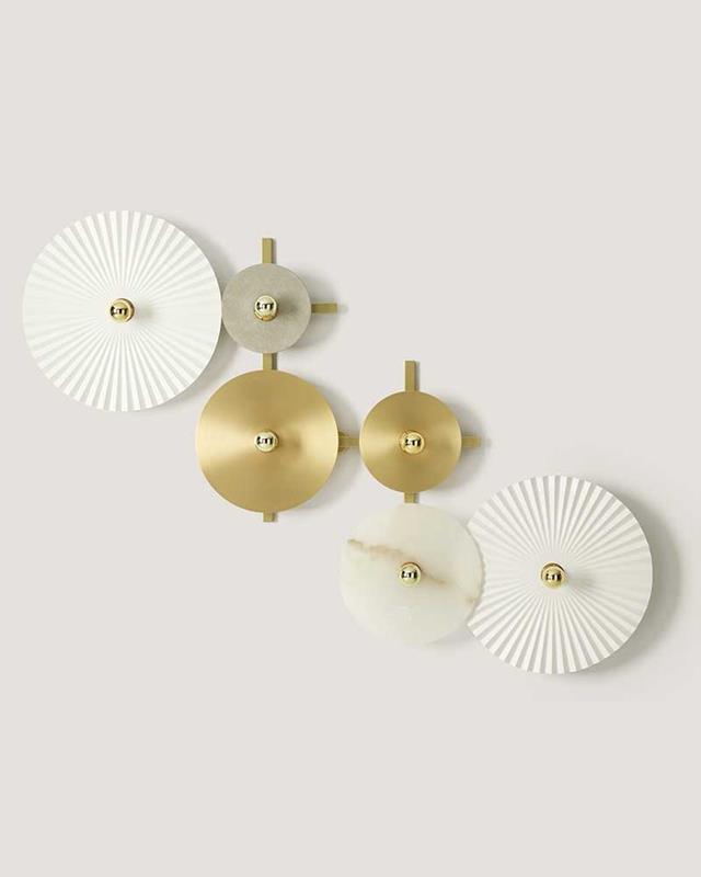 Aplique de pared compuesto de una estructura metálica con accesorios de diferentes materiales y tamaños