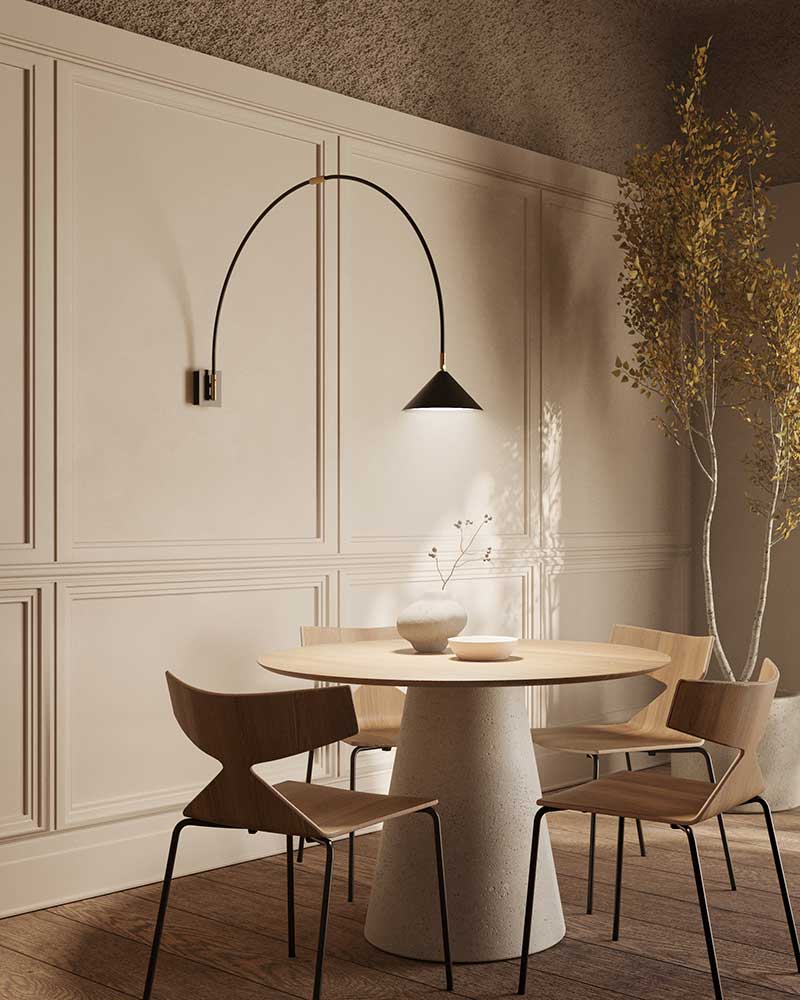 Aplique de pared orientable y extensible en diferentes acabados con iluminación LED integrada en too cálido y regulable en intensidad.