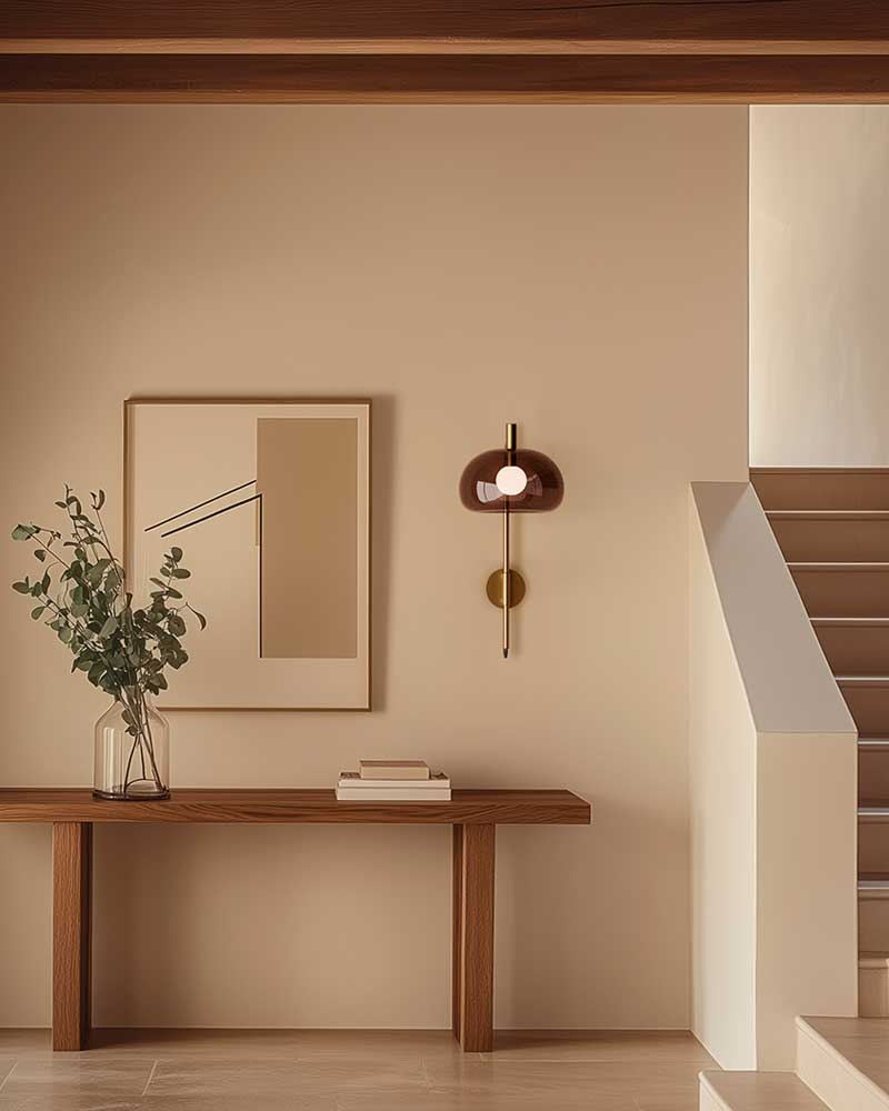 Aplique de pared fabricado en metal en diferentes acabados con tulipa de cristal transparente y tulipa interna esfera Opal blanco.