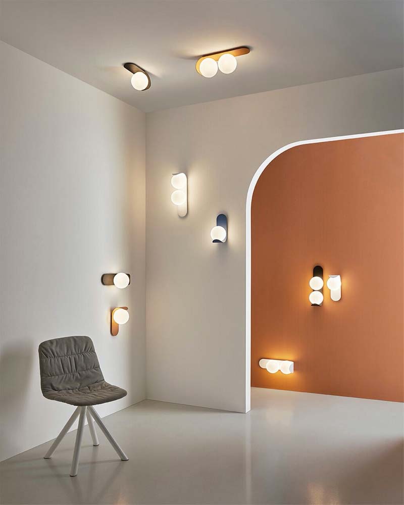 Aplique de pared o techo fabricado en metal en diferentes acabados con 1 o 2 tulipas esféricas de cristal opal, según versión.