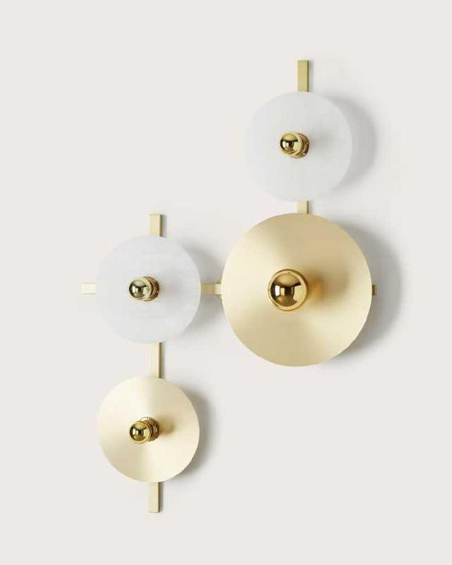 Aplique de pared compuesto de una estructura metálica con accesorios de diferentes materiales y tamaños