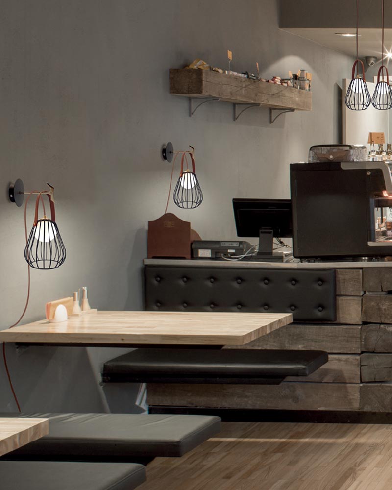 Aplique de pared fabricado en metal disponible en diferentes acabados, cable textil, tulipa de cristal y cable decorativo con funda textil.