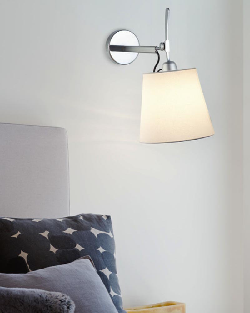 Aplique de pared fabricado en metal en acabado cromo y gris plata con tulipa de tela en color blanco.
