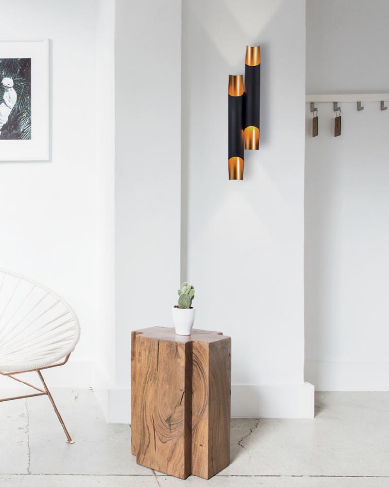 Aplique de pared fabricado en aluminio en color negro y oro.