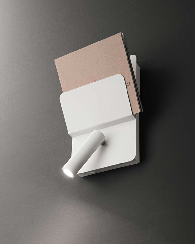 Aplique de pared con repisa disponible en color blanco o negro con luz de lectura LED y USB