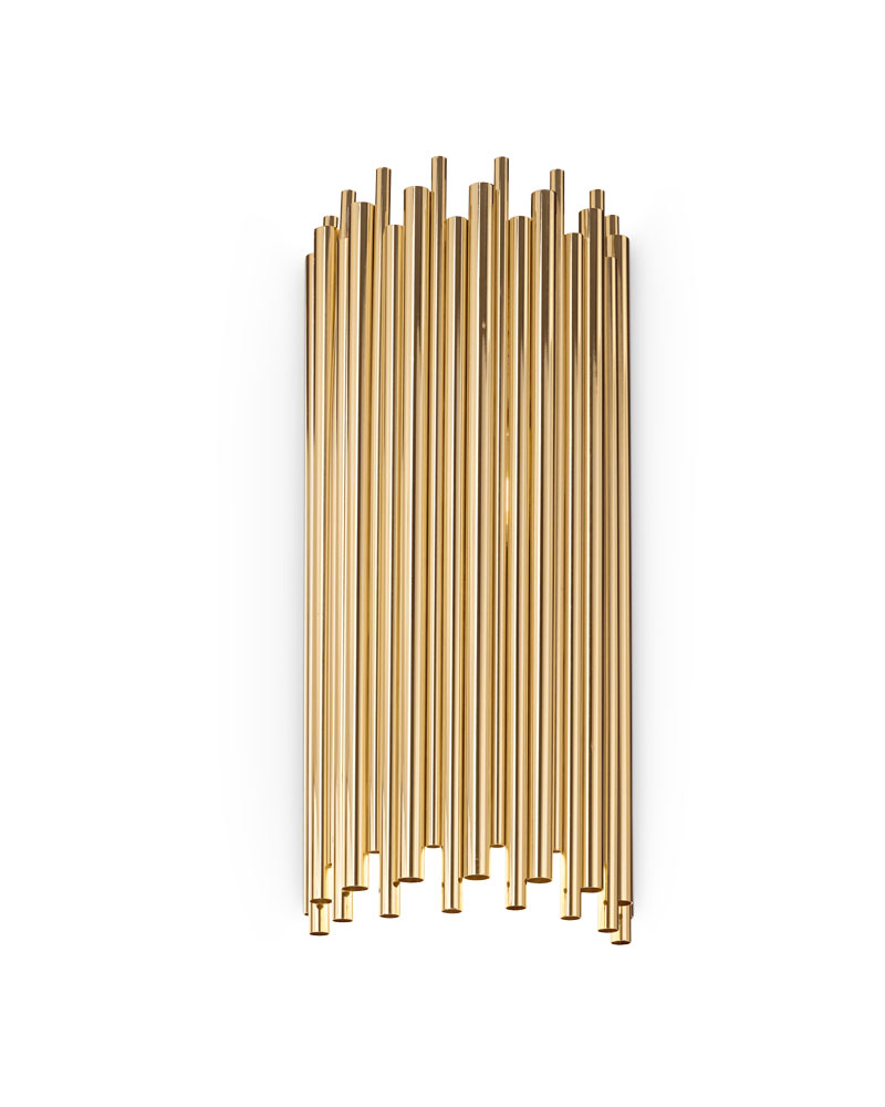 Aplique de pared decorativo fabricado con tubos metálicos en acabado oro.