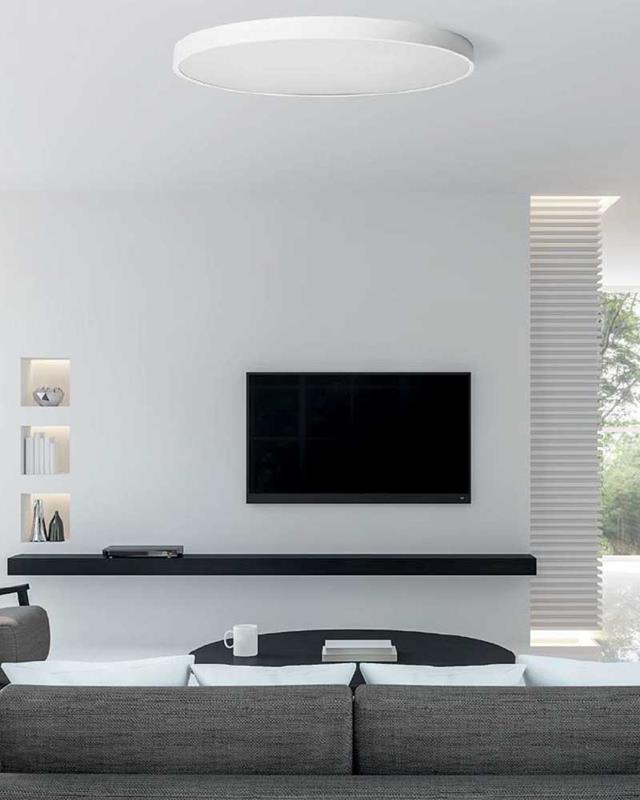 Large ceiling light made of metal in white or black with opal diffuser and integrated dimmable LED lighting with CCT tone change and remote control.