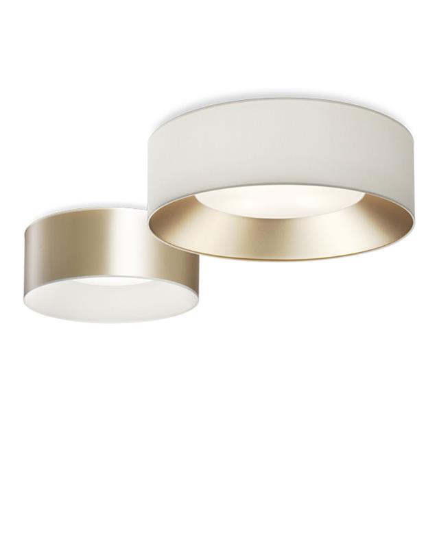 Ceiling ceiling lamp made of iron matt gold finish and screen with cream cotton fabric with opaque gold fabric interior or vice versa.