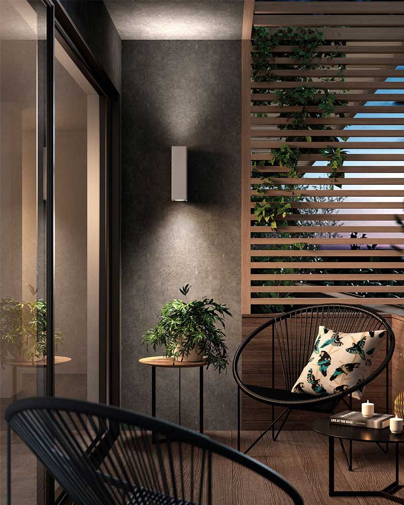 Outdoor wall light made of cement in different finishes with top and bottom lighting and IP65 protection.