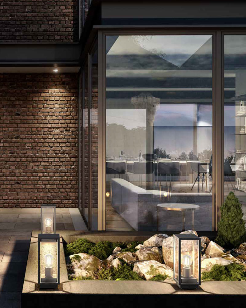 Outdoor lamp with IP54 water protection for over-wall or floor installation, made of graphite-colored aluminum and transparent glass diffusers.