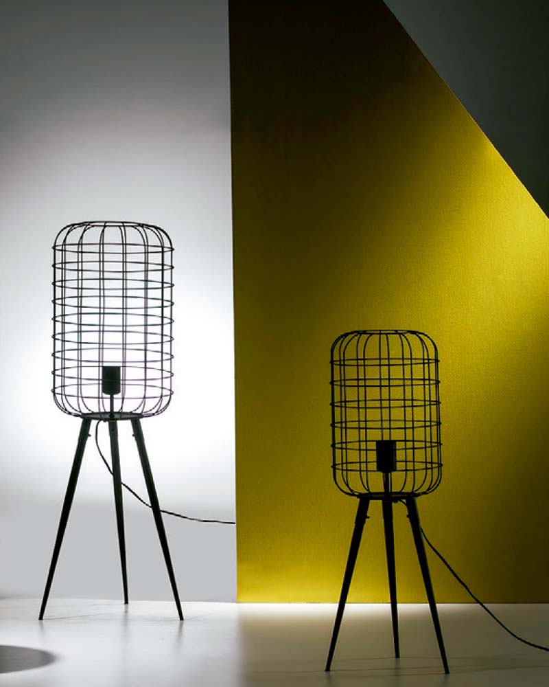 Floor lamp made of metal in black industrial style and grid screen.