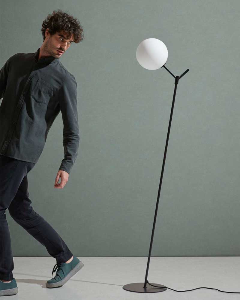 Metallic floor lamp available in matt black or matt brass finish with spherical glass tulip.