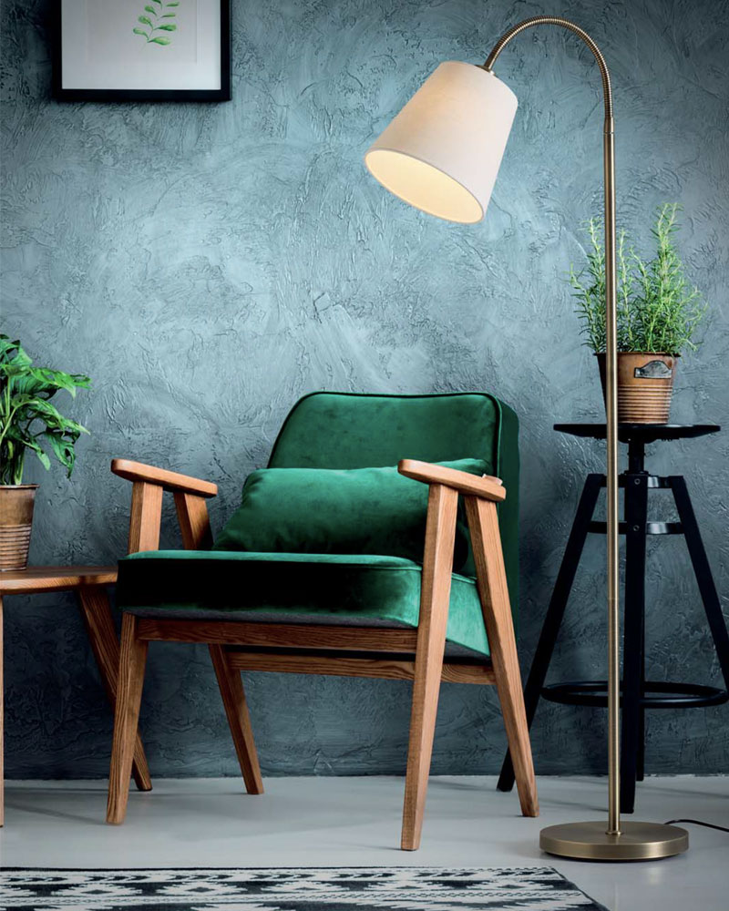 Floor lamp made of metal with white fabric shade. Available in different finishes. Flexible and adjustable top.