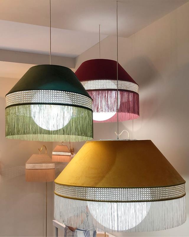 Hanging lamp made of velvet fabric in different colors, thread fringes and Natán in natural finish.