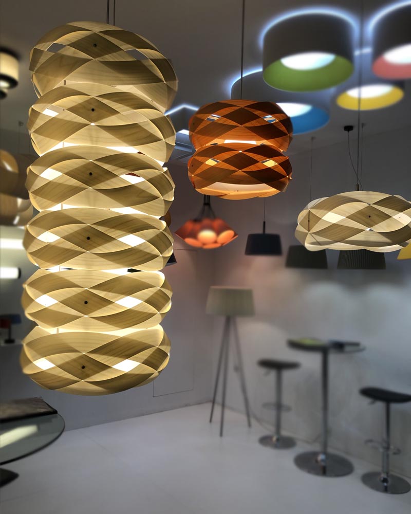 Hanging lamp made by hand in wood veneer available in different finishes and formats