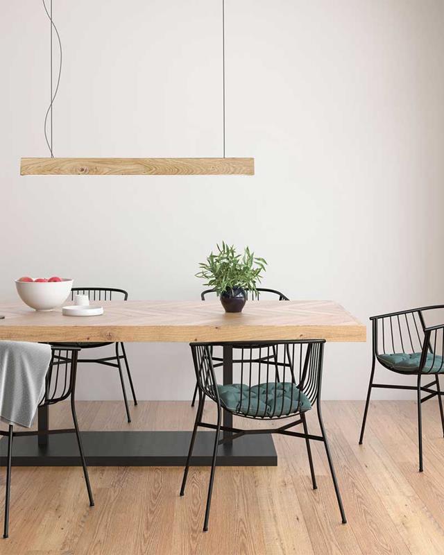 Hanging lamp in natural ash wood with integrated LED lighting in a warm 3000ºk tone and suspension using height-adjustable steel cables