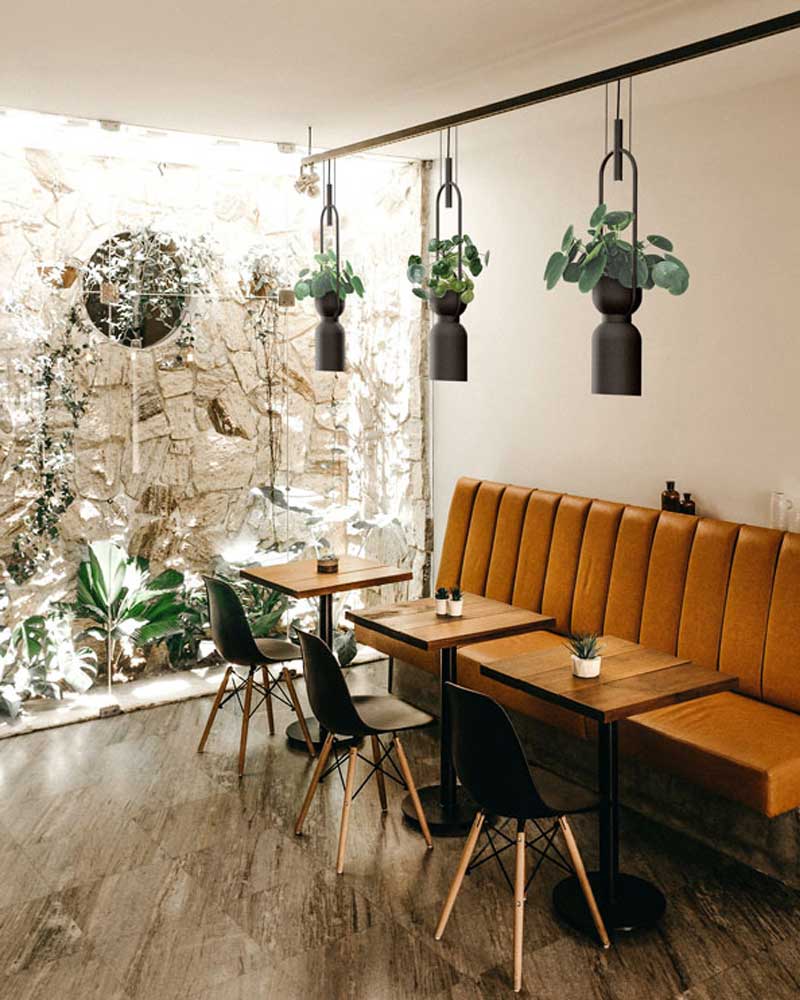 Hanging lamp made of metal in white or black with integrated LED lighting and E-27 lamp holder. Top support for plants or decorative cements.