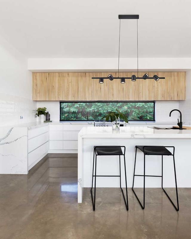 Linear hanging lamp made of metal in a white or black finish with 6 adjustable spotlights.