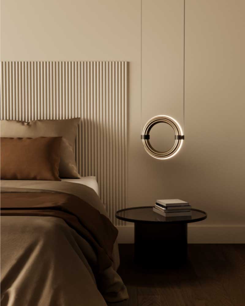 Designer hanging lamp with integrated LED lighting in a warm tone and available in gold or black