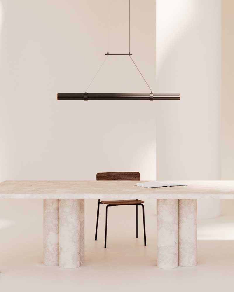 Hanging ceiling lamp made of walnut wood with metal details in different finishes to choose from.
