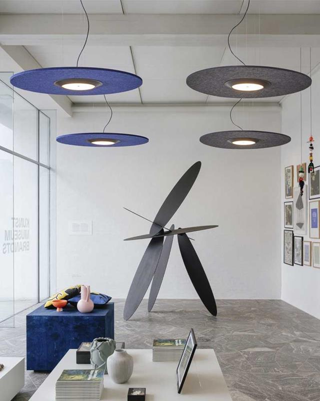 Hanging lamp made of sustainable sound-absorbing materials that help reduce ambient noise.