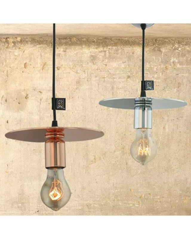 Hanging lamp composed of a metal disk with lampholders of the same material available in different finishes to choose from.