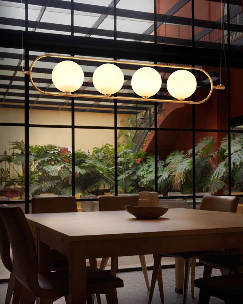 Hanging lamp made of metal finished in matt gold color with 4 spherical tulip opal or transparent glass.