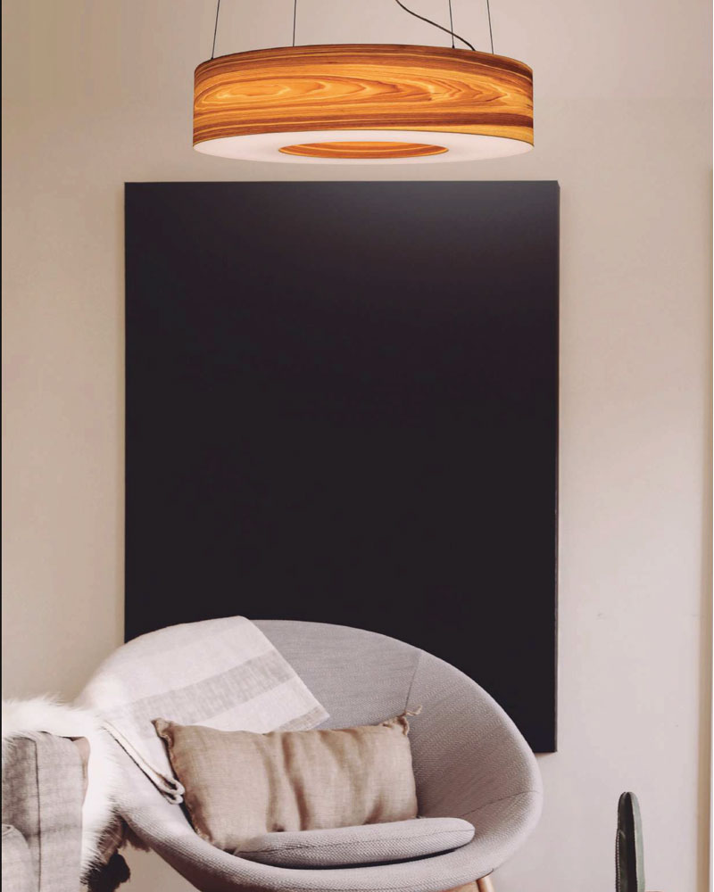 Hanging ceiling lamp made of wood veneer in different finishes and sizes. The diffuser is opal white methacrylate.