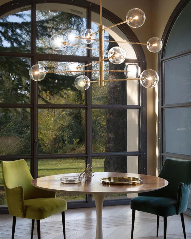 Large hanging lamp made of metal available in chrome or aged brass finish. The lamp has 12 arms that can be oriented and placed.