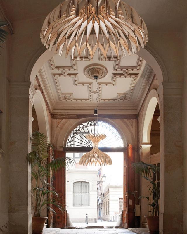 Light source by projection on top of the lamp providing a beautiful mosaic of lights and shadows due to the transmission of light through the geometric shape of the wooden screen.