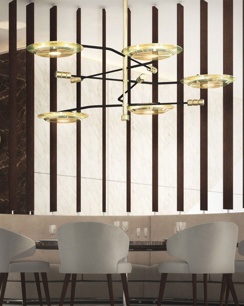 It incorporates 9 or 15 G9 lampholders, depending on the version of 3 or 5 arms respectively.