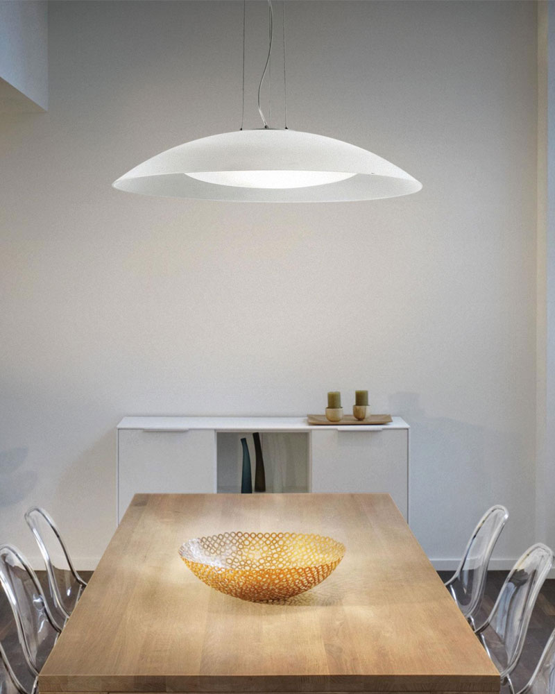 Hanging lamp with chromed metal frame and double glass diffuser, one exterior available in several finishes and one internal white opal.