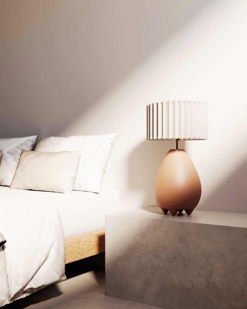 Table lamp handcrafted in ceramic with metal details and pleated fabric lampshade