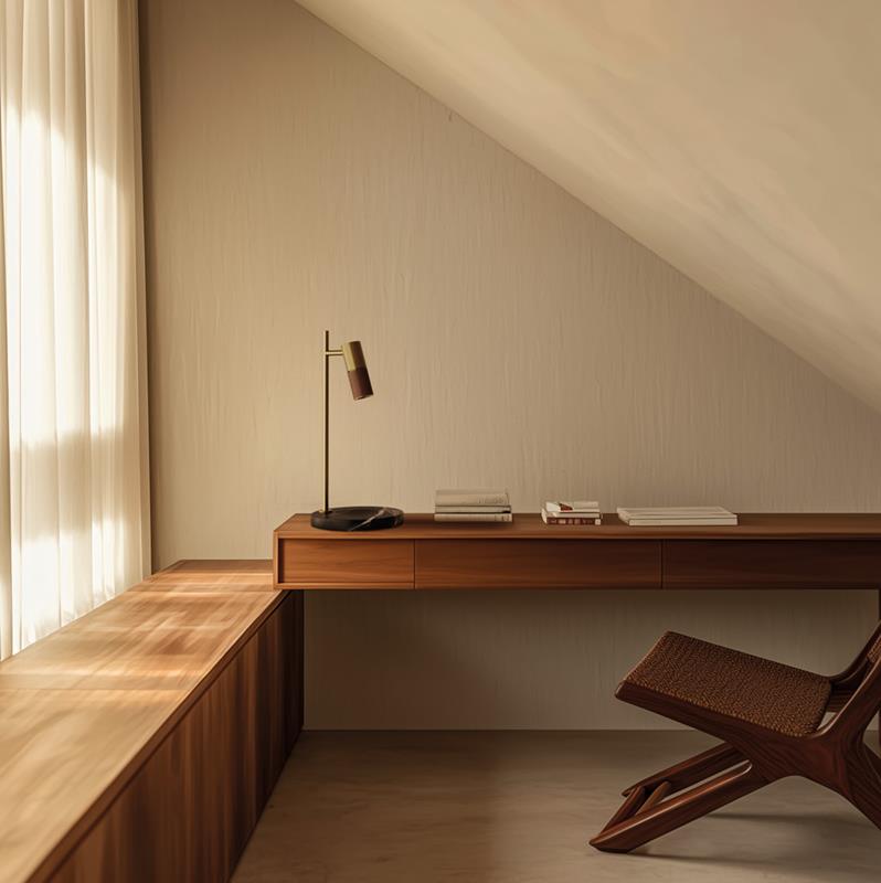 Metal wall table available in different finishes with a leather head in a choice of colors, marble base, and an integrated LED.