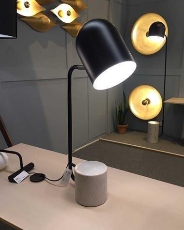 Table lamp composed of a white marble base, black structure and adjustable tulip.