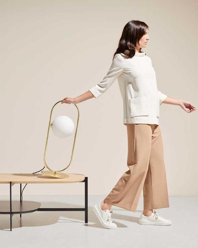 Table lamp composed of a metallic structure in matt gold finish with spherical glass tulip of 20cm diameter available in opal or transparent finish.