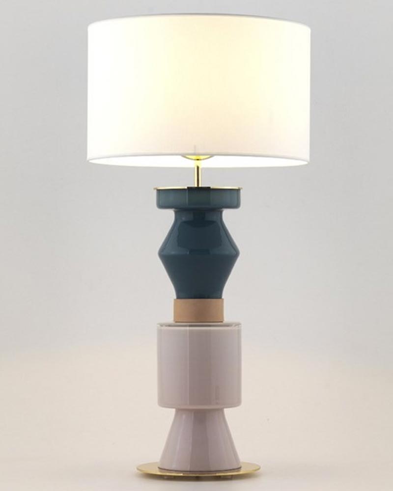 Table lamp composed of a structure in metal, natural leather and glass in different finishes.