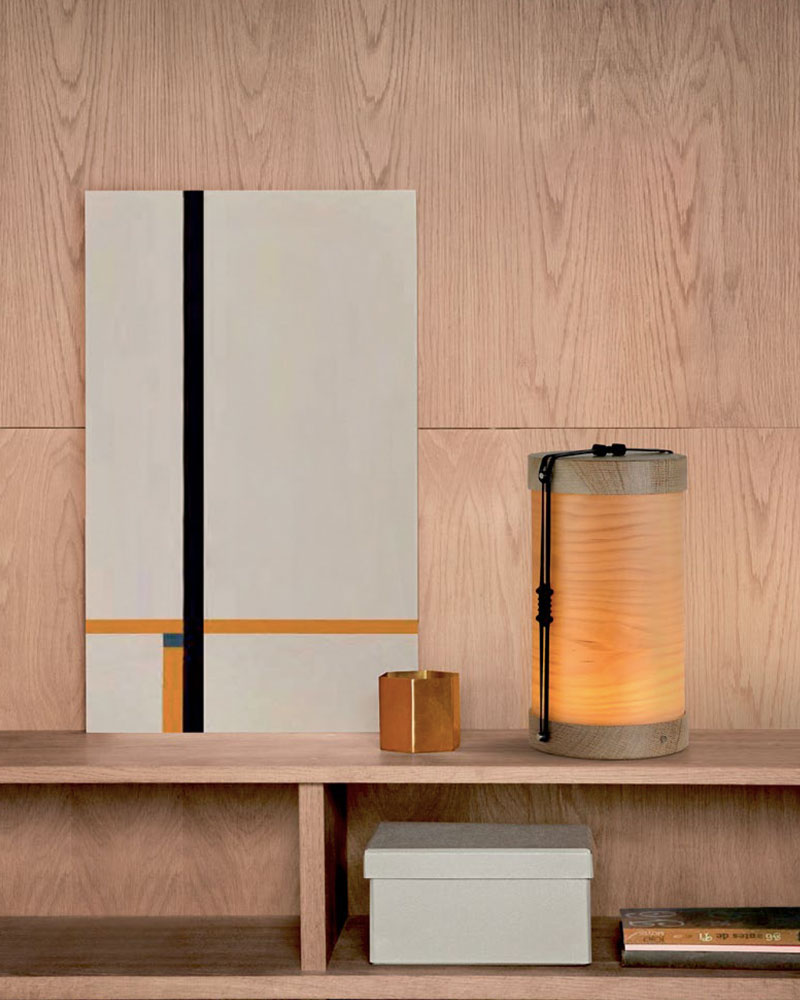 Portable table lamp with rechargeable battery via micro usb. The lamp is made of natural maple wood curved on a natural oak base.