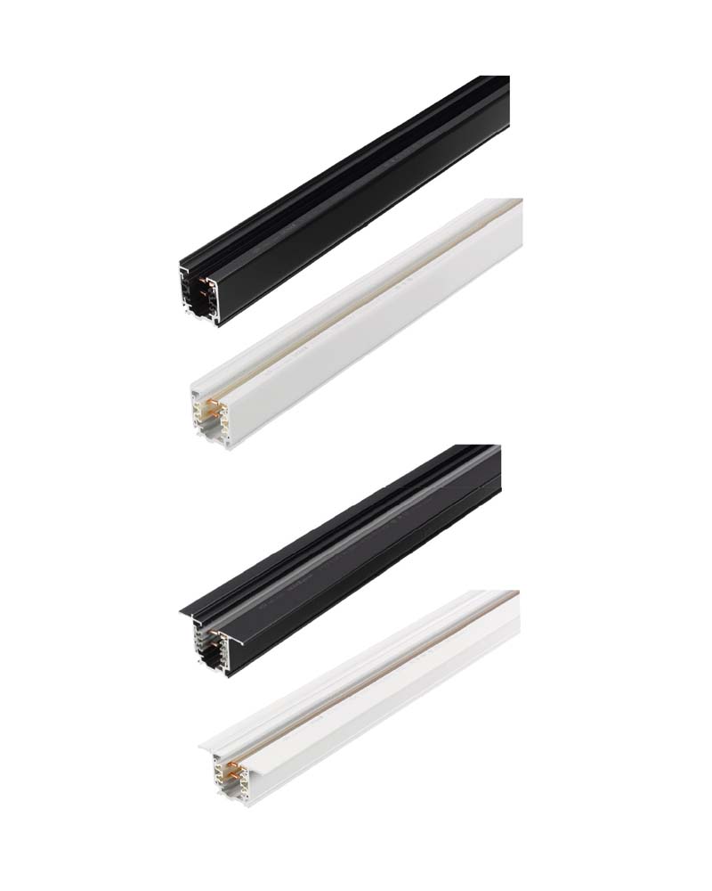 Three-phase aluminum rails in white or black for surface mounting, recessed or suspended.