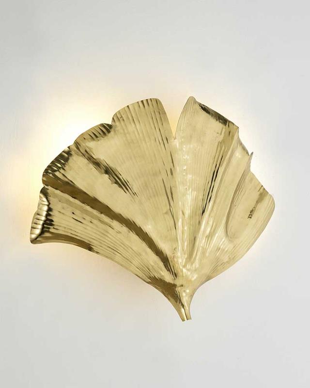 Wall light with a very decorative leaf shape in golden color.