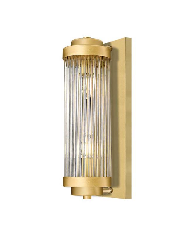 Vintage-style decorative wall light made of metal in a matte gold finish with a transparent striated glass diffuser.