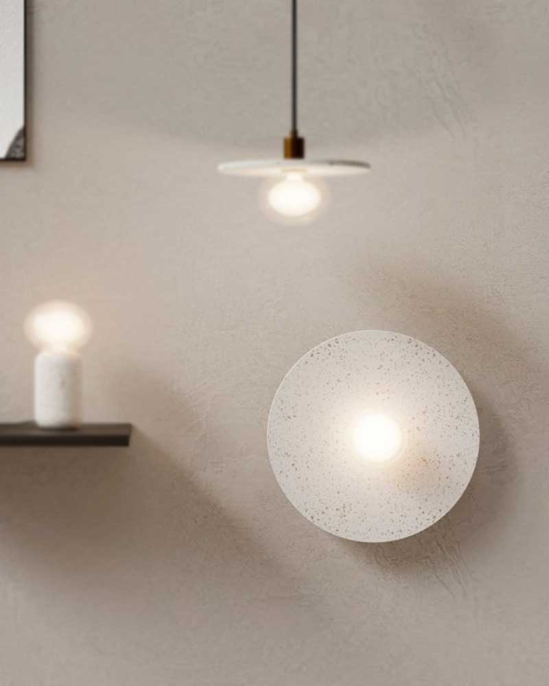 Circular wall light available in 2 sizes made of handmade terrazzo with transparent and opal glass lampshades