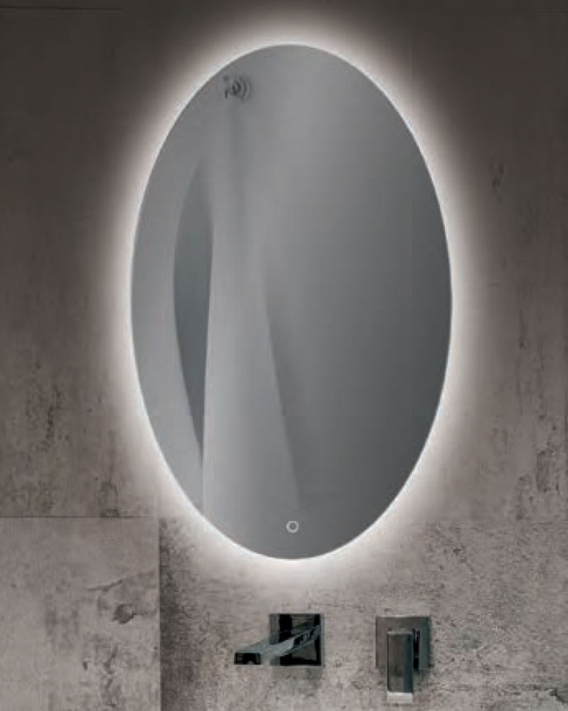 Espejo de baño para instalación en pared de forma ovalada con iluminación LED integrada en la parte posterior.