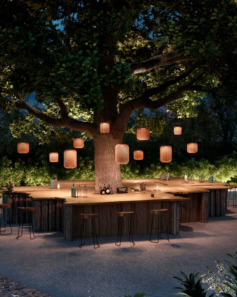 Lámpara de colgar para exterior fabricada en metal y con pantalla de fibra sintética trenzada a mano. Fabricadas en España.
