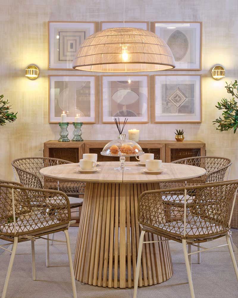 Lámpara de colgar para exterior fabricada en ratán sintético, lo que la hace muy resistente a las condiciones ambientales.