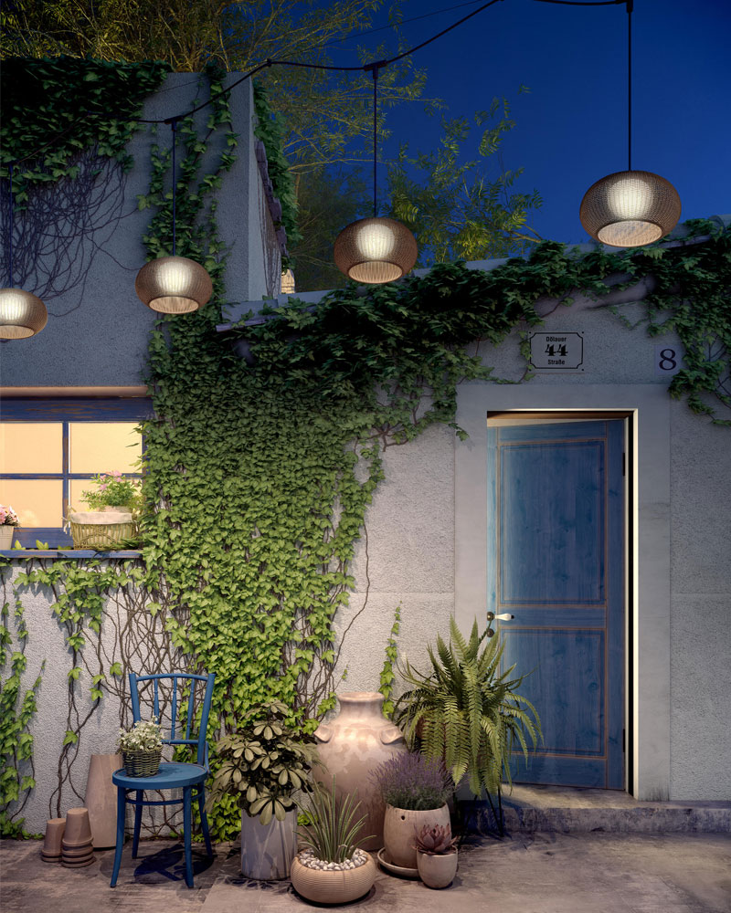 Lámpara colgante de exterior tipo guirnalda decorativa compuesta por una linea de 5m con 4 lámparas colgante con tulipa de ratán sintético en color marrón con difusor interno opal.